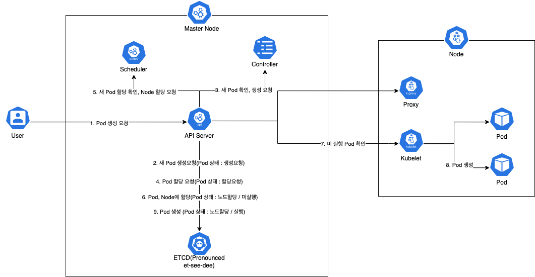 변경의 차이 create, apply 모두 스펙에 따라 pod 생성을 하는 기능을 갖고 있지만, 스펙 파일을 일부 변경하고 create를 호출하면 이미 만들어진 오브젝트이기 때문에 실행이 불가능하다. 하지만 apply는 생성이 아닌 적용이기 때문에 변경한 스펙에 맞춰준다는 특징이 있다. create문 재호출 $ kubectl create -f ./pod.yaml $ # pod.yaml 수정 $ kubectl create -f ./pod.yaml Error from server (AlreadyExists): error when creating "pod.yaml": deployments.apps "deploy-sample" already exists apply문 재호출 $ kubectl apply -f ./..